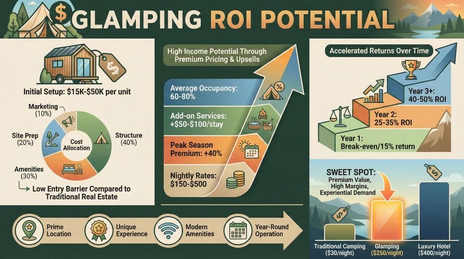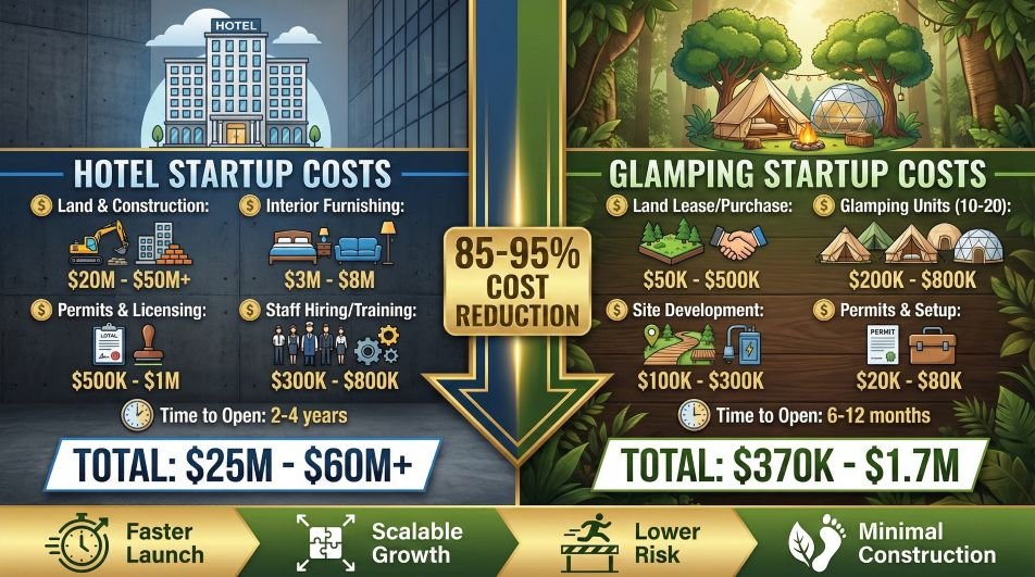 Compared to building a hotel or resort, glamping tents, domes, or cabins typically require far less capital and infrastructure.