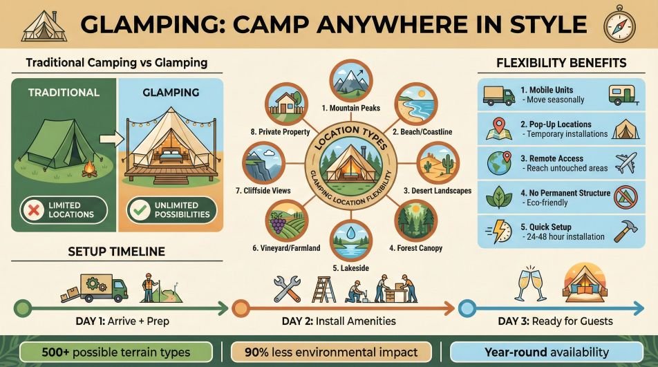 Glamping works in rural, coastal, forested, or off-grid locations where traditional accommodations aren’t feasible.