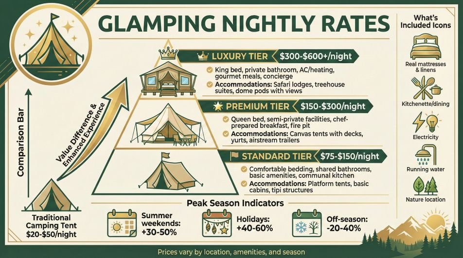 Glamping accommodations often command higher prices than standard camping or short-term rentals due to their novelty, comfort, and Instagram appeal